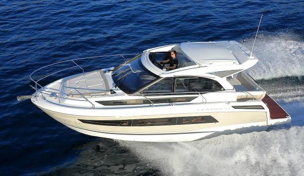 The new Leader 33 benefits from a contemporary, sporty look that is the signature of the Leader line. This model is offered in two versions: an Open version with an arch, or a Sport Top version with an electrically opening hard top. Powered by twin Volvo D3 220hp diesels with joystick control and bowthruster offering excellent on the water performance and great maneuverability. Interior Forward cabin with double berth, hull windows and opening portholes. Aft cabin with 2 single berths (converts to double berth), lockers, drawers and storage, portholes and windows. Fresh water electric toilet and shower in separate compartment. Galley Galley with stainless steel sink Gas cooker 80 L fridge Hot water Electronics Raymarine eS97 display (gps chartplotter /sounder with touchscreen) preloaded with Navionics cartography (sd card eu, n. america or row) wifi wireless module Raymarine and P79 depth transducer Inventory Electric windlass Water heater Shower in heads (mixer tap + water drain) 220v shore power fitting + charger Skylights in saloon Ambiance pack (outside steps led lights + inside indirect lighting) Ventilation Pack (opening deck hatch in fwd cabin + cockpit porthole in aft cabin) Opening sportop window on port side Aft closing canopy Dark Smoke Bowthruster Trim tabs Raymarine VHF radio DSC Teak cockpit floor Anchor kit Mooring Kit Manufacturer Provided Description The new Leader 33 benefits from a contemporary, sporty look that is the signature of the Leader line. This model is offered in two versions: an Open version with an arch, or a Sport Top version with an electrically opening hard top. The spacious cockpit allows you to entertain in comfort and style. You will particularly appreciate the attractive exterior living area and clever layout of the cockpit saloon, where you can relax on the aft bench seat that transforms into a sundeck while sharing exceptional moments with friends and family around the table in the immense cockpit! Below, you will be amazed by her interior volume and refined design. Long windows in the hull offer impressive sea views and bathe the interior in natural light. The functional layout lends itself to spending enjoyable moments on board: the galley features numerous storage solutions, and the head compartment offers a high level of comfort with a shower partition. The modular saloon easily transforms into a beautiful private cabin with pocket door. With her generous living spaces, offering an entirely open layout by day, or a cosy atmosphere for greater privacy at night, the Leader 33 adapts to suit your rhythm and lifestyle! Disclaimer Disclaimer