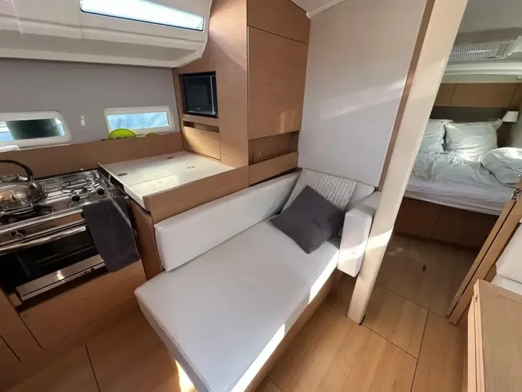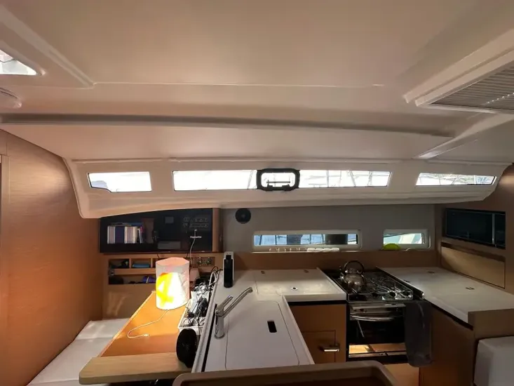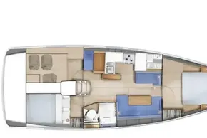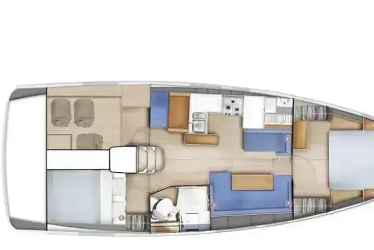 The 410 can be configured in a 2-cabin or 3-cabin arrangement with queen size berths. It is available with either a single aft head or an additional head forward in the master cabin. Both heads offer separated shower compartments. Whether overnighting, entertaining, or day sailing, the Sun Odyssey 410 strikes the perfect balance between performance and comfort.